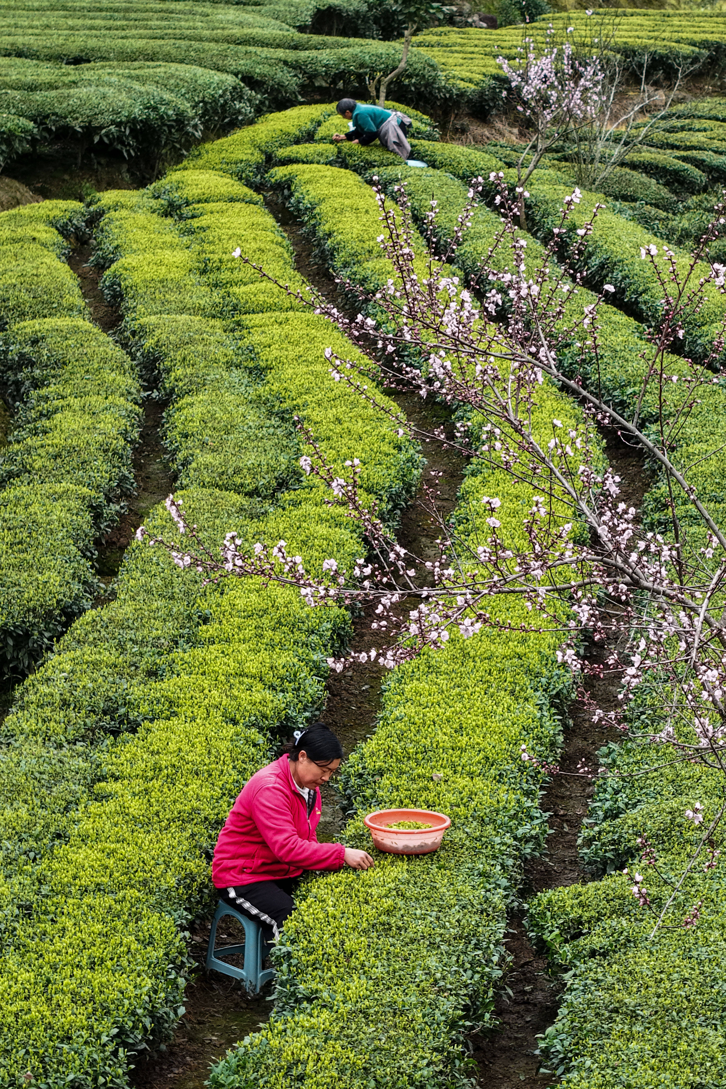 采茶工正在茶山上采茶。新华社发(无人机照片)“以前我们年年搞‘春风行动’,目的是把人送出去;现在是把人引回来。”毕华表示,今年通过直播带岗,为茶企达成就业意向2000多人,其中一半以上是返乡人员。